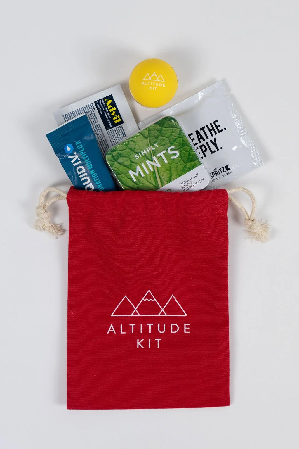 Advil Packet (2), Dermatone Facestick SPF 50, Dermatone SPF Lip Balm (assorted flavors), Oxygen Mini Can, Element Hydration Packet (assorted flavors), Altitude Adjustment Supplement, and Hand Cream (assorted scents) - Bundled in our signature Altitude Kit cylinder in client’s choice of stock color.